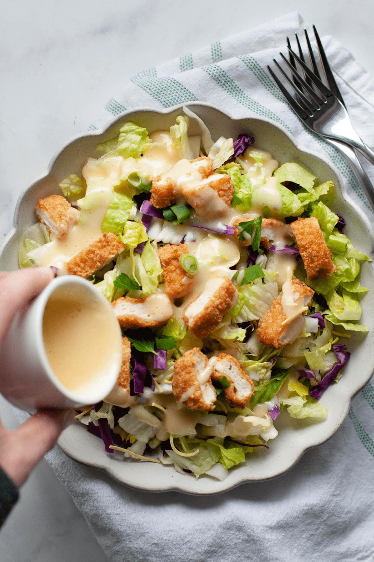 Juicy chicken mingles with crunchy noodles and an array of vibrant vegetables, all tossed in a luscious dressing bursting with Asian flavors.
