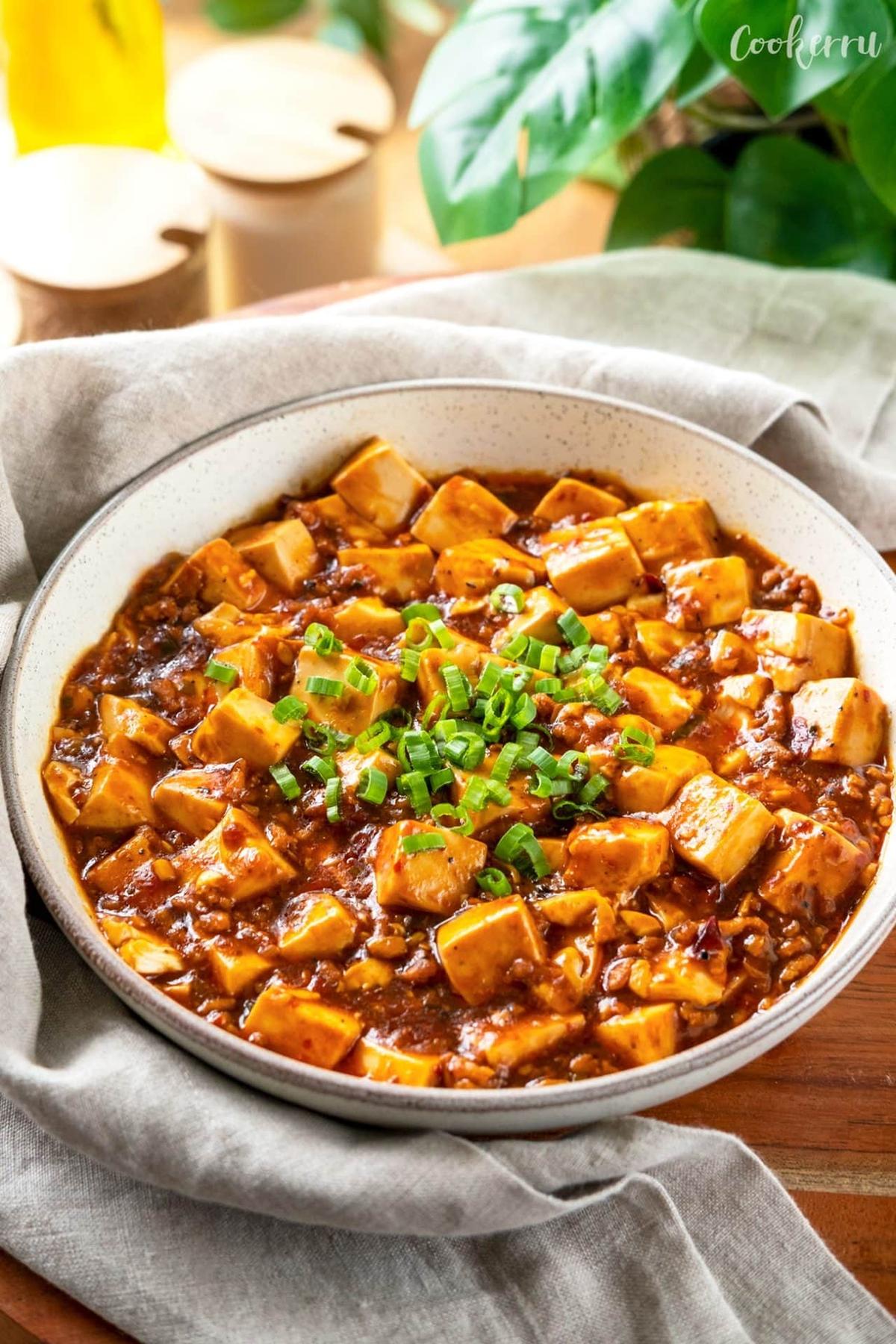Cubes of silky tofu simmer in a rich sauce, bursting with the heat of spicy bean paste and dried chili.