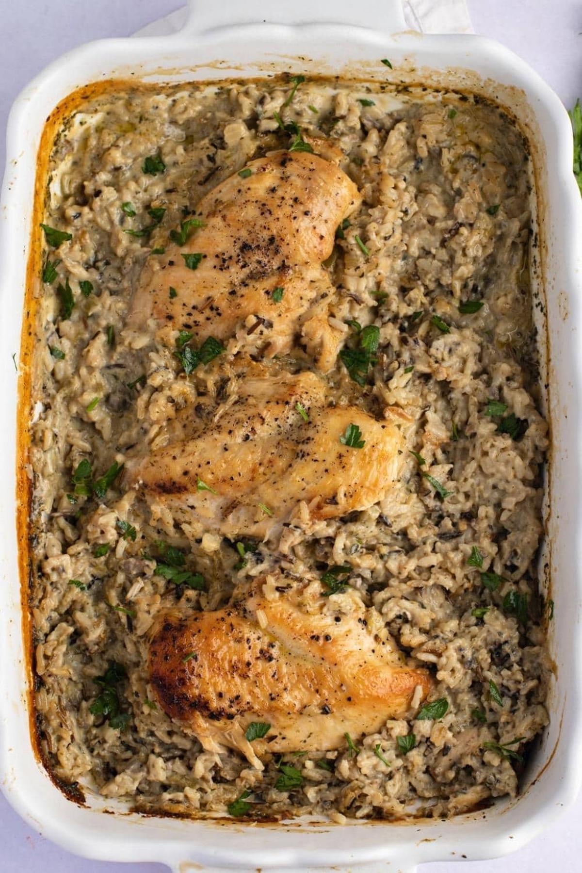 A no-peek chicken and rice casserole brings comfort to your Sunday dinner.
