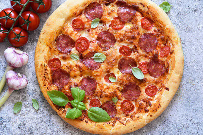 The pizza is made with vegetables, meat, cheese, tomato sauce, and wheat flour. The flour is baked in a round pan or baking sheet. Its shape resembles a lake where you can fill it with cheese, vegetables, and meat in the middle and tomato sauce on the top.
