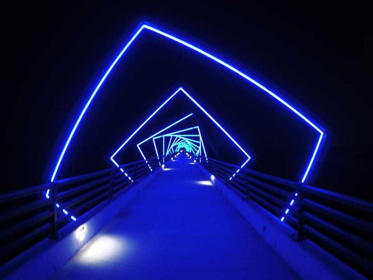 High Trestle Trail Bridge in Madrid is a stunning example of how art and infrastructure can blend seamlessly. Spanning half a mile and standing 130 feet above the Des Moines River, this bridge is especially mesmerizing at night when its spiraling steel frames are illuminated.