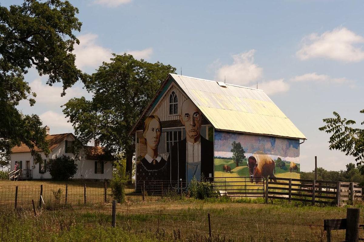Driving by, you can appreciate the homage to Iowa’s rich artistic heritage while also enjoying the rural landscape that inspired Wood’s original masterpiece.