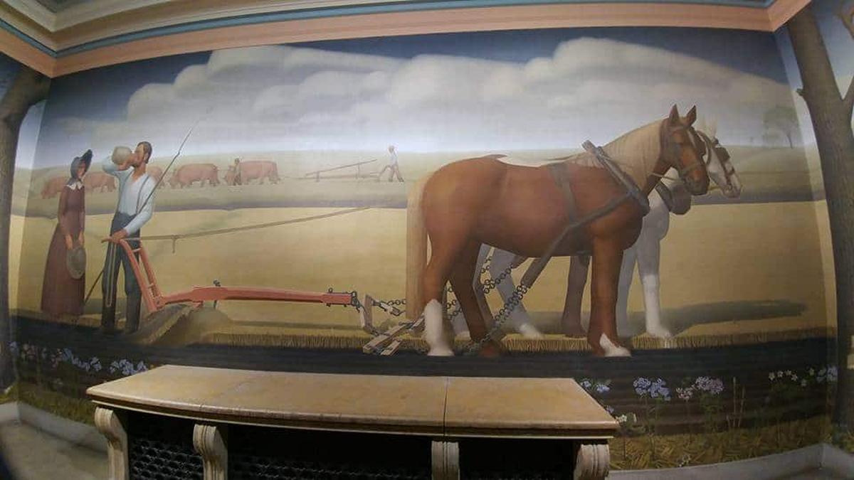 Grant Wood’s legacy in Iowa extends beyond his famous “American Gothic” painting. In Ames, the walls of the Parks Library at Iowa State University are adorned with his murals, depicting scenes of agricultural life.